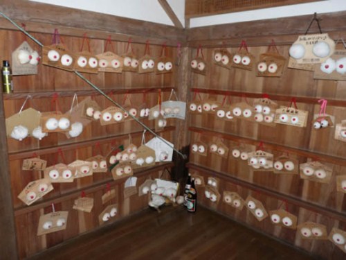Most women come to Karube Shrine to pray for a safe child birth, abundant lactation and breast cancer healing, but there are those who ask the Goddess of Breasts for a bigger bust. Those boob-like things that decorate the shrine’s interior are Ema, small wooden planks, where worshipers write their prayers and requests, in the hope that the god receive them. They cost about $21, and can be ordered online, if you’re interested.
